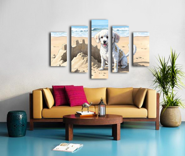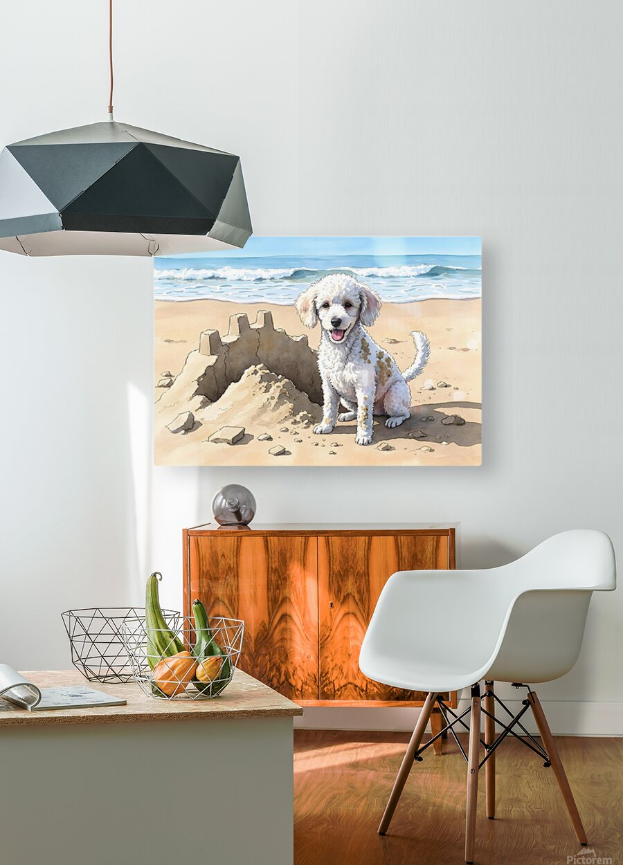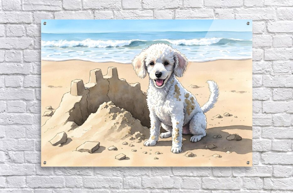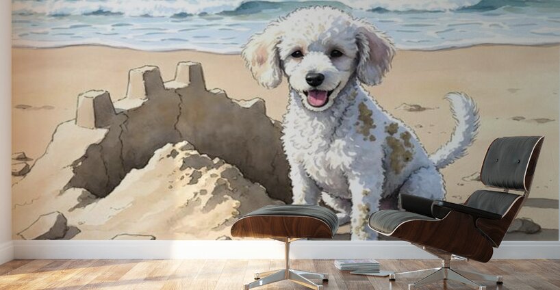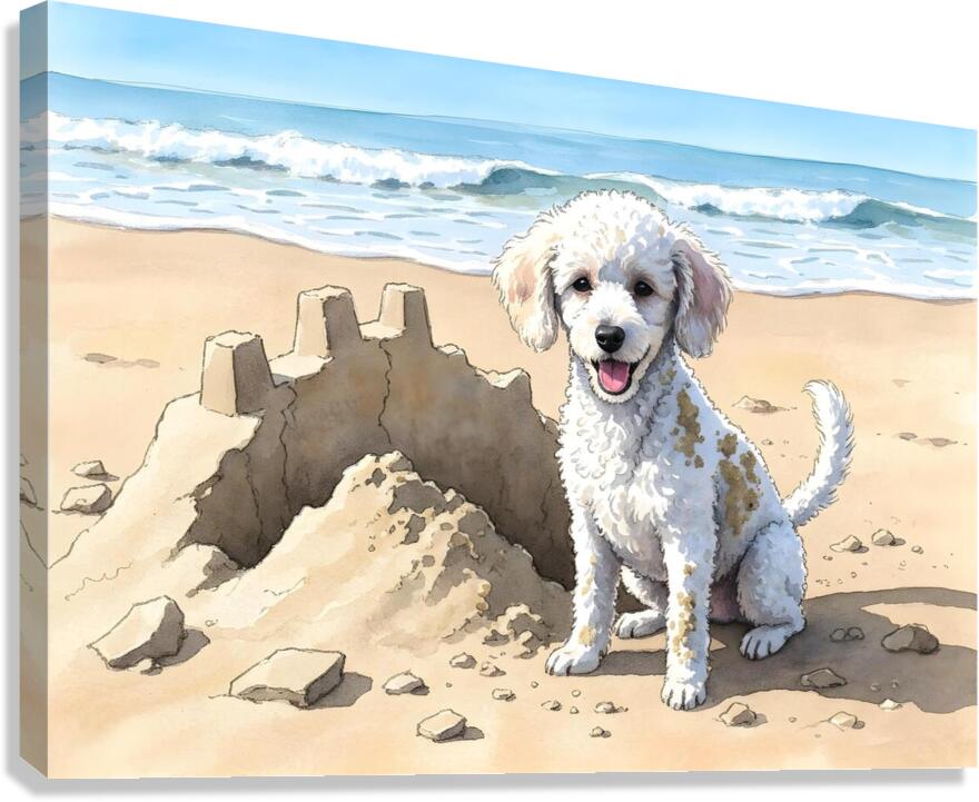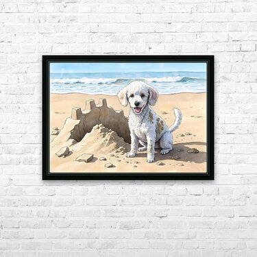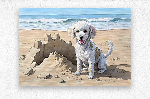 The white poodle puppy sits contentedly among the collapsed remains of the sand castle, its curly coat dusted with golden sand particles. The puppy appears delighted with the outcome, tail wagging amid the scattered sandy debris. Digital Artwork.