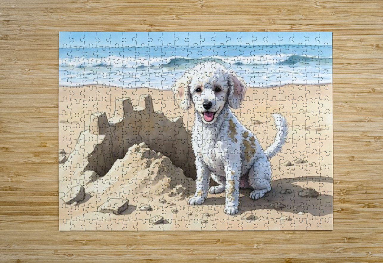 Happy White Poodle Puppy Sits In Destroyed Sand Castle Ruins Puppy Prints Puzzle