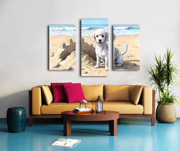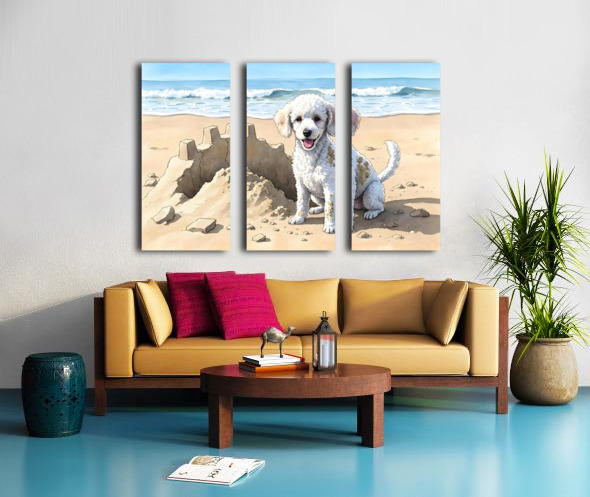 Happy White Poodle Puppy Sits In Destroyed Sand Castle Ruins Canvas print