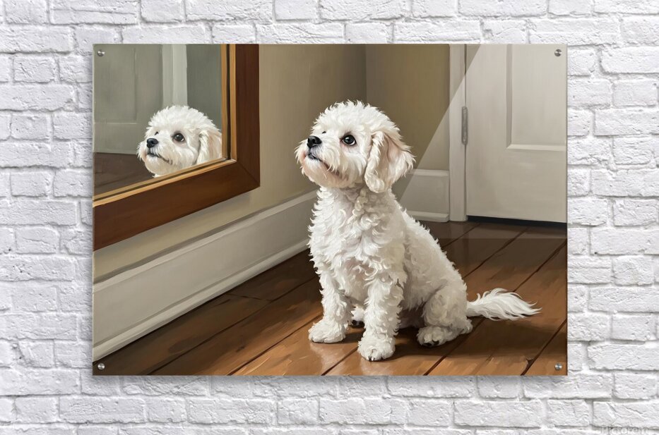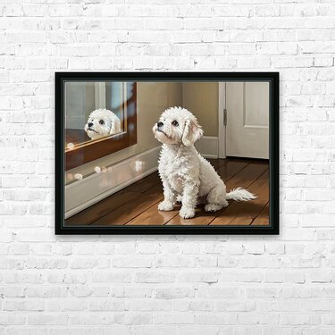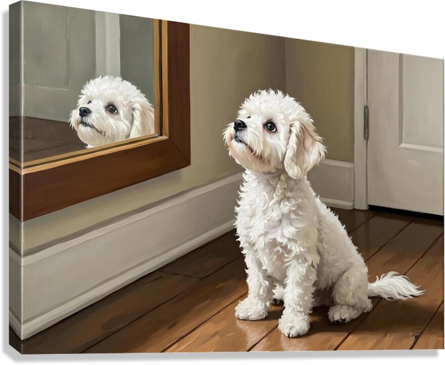 Get this artwork "Curious White Bichon Frise Puppy Discovers Mirror For First Time" in a framed print.