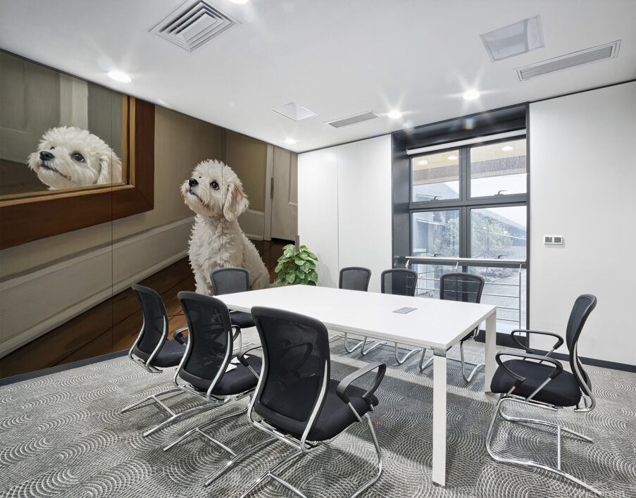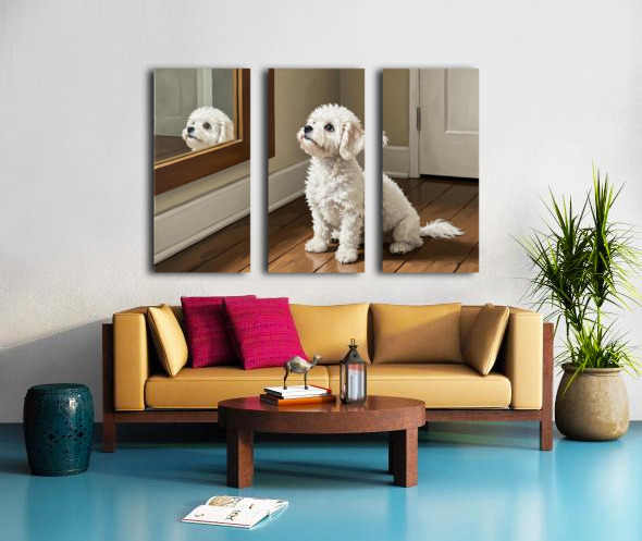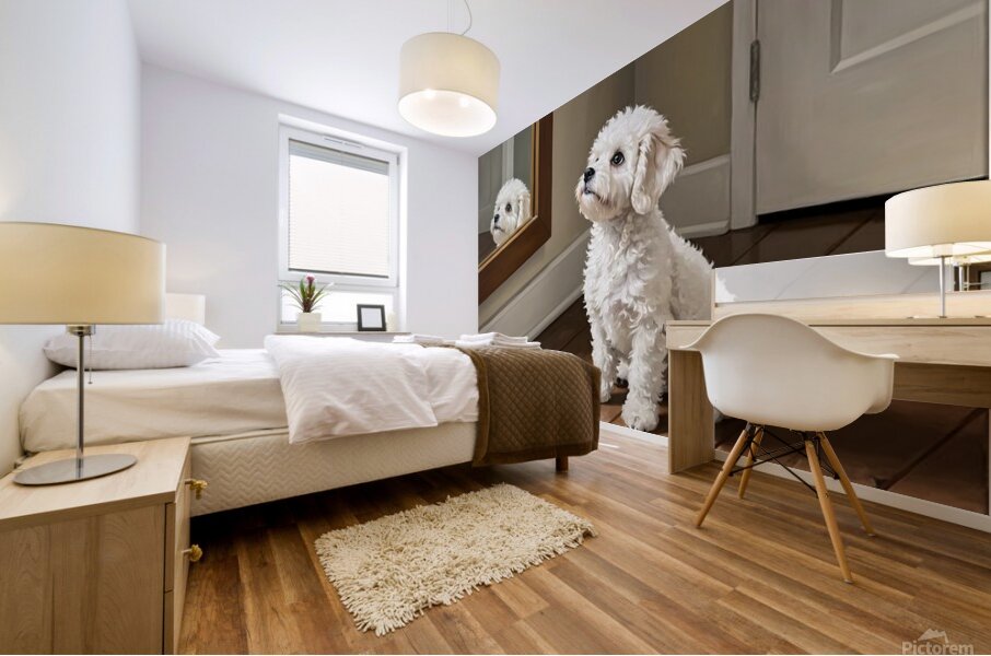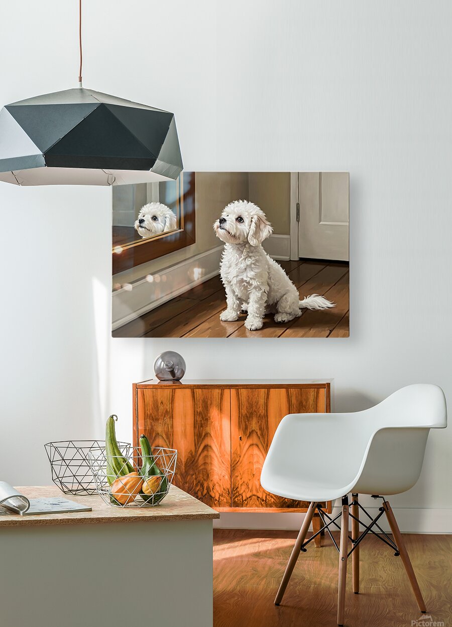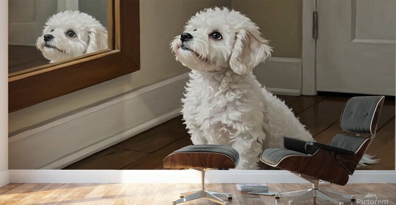 A fluffy white Bichon Frise puppy sits on polished wooden flooring gazing up at a wall-mounted mirror with innocent curiosity. The puppys curly white coat catches soft light streaming through the room. Digital Artwork.