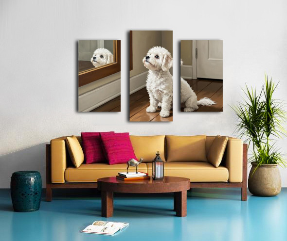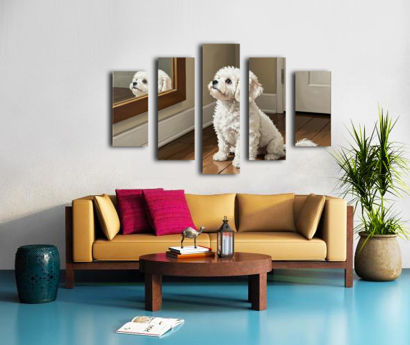Curious White Bichon Frise Puppy Discovers Mirror For First Time Canvas print