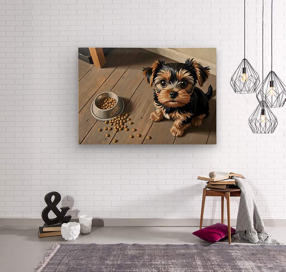 ABOUT THIS ARTWORK: BROWN YORKSHIRE TERRIER PUPPY WITH OVERTURNED FOOD BOWL