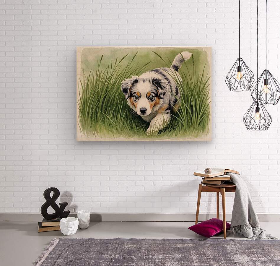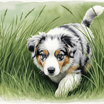 ABOUT THIS ARTWORK: BLUE MERLE AUSTRALIAN SHEPHERD PUPPY SEARCHES THROUGH TALL GRASS