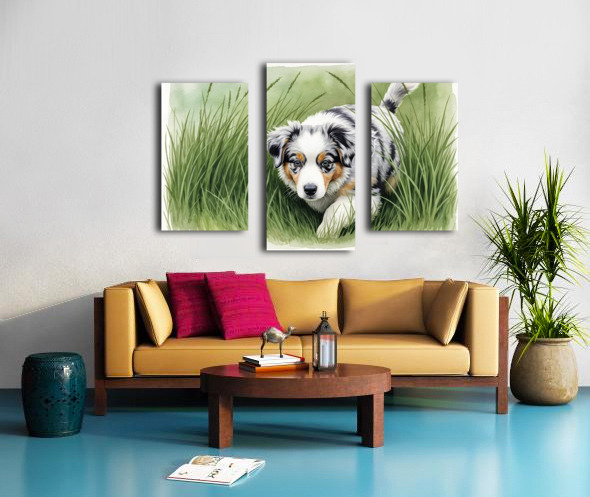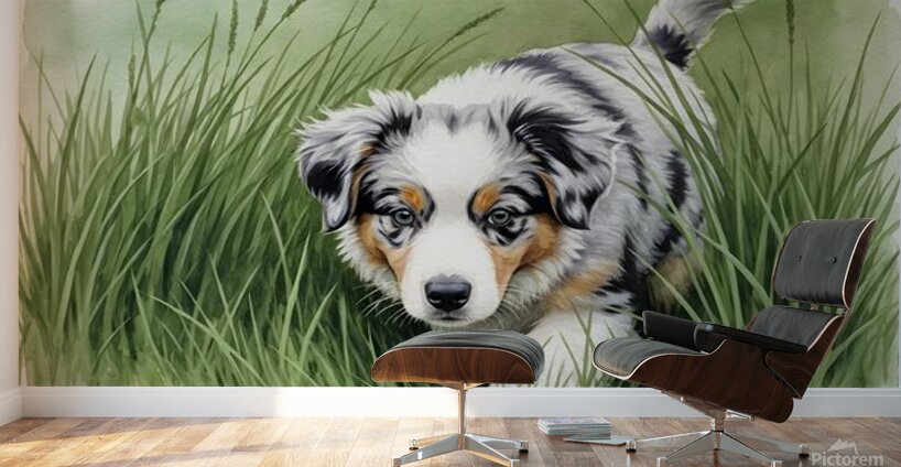 Get this artwork "Blue Merle Australian Shepherd Puppy Searches Through Tall Grass" in a framed print.