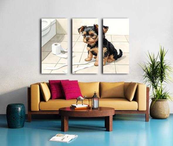 Get this artwork "Brown Yorkshire Terrier Puppy With Unrolled Toilet Paper Trail" in a framed print.