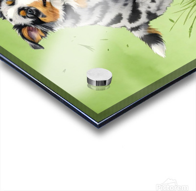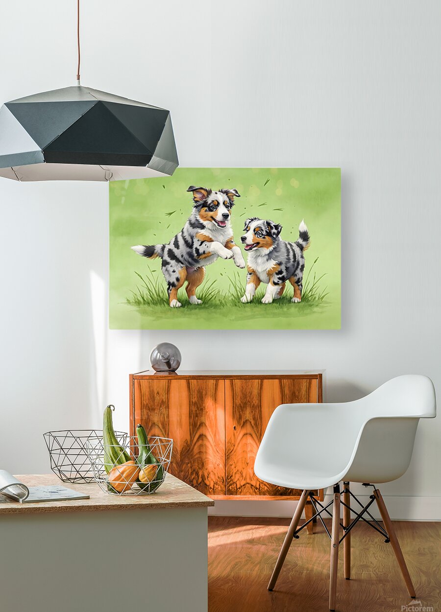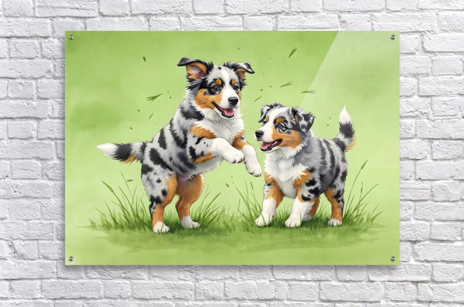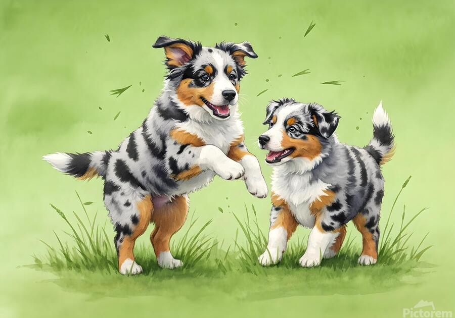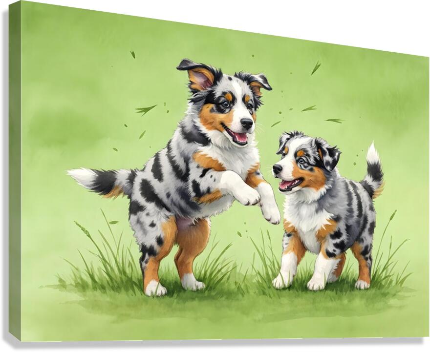 ABOUT THIS ARTWORK: BLUE MERLE AUSTRALIAN SHEPHERD PUPPIES PLAYING TOGETHER