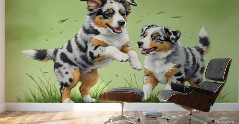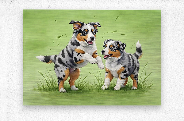 ABOUT THIS ARTWORK: BLUE MERLE AUSTRALIAN SHEPHERD PUPPIES PLAYING TOGETHER