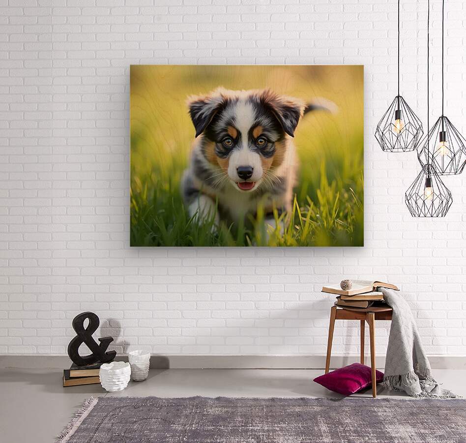 ABOUT THIS ARTWORK: BLUE MERLE AUSTRALIAN SHEPHERD PUPPY READY TO PLAY HIDE AND SEEK