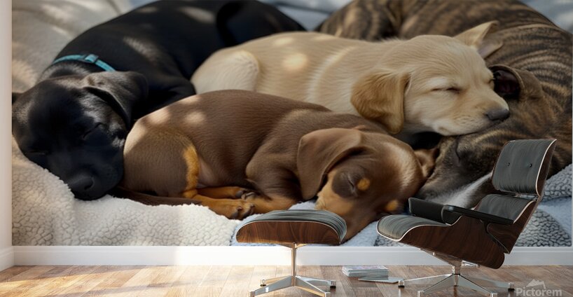 A content brown and tan dachshund puppy sleeps peacefully curled up with other colorful puppies in a warm cuddle pile on soft blankets, all exhausted from their playful adventures. Digital Artwork.
