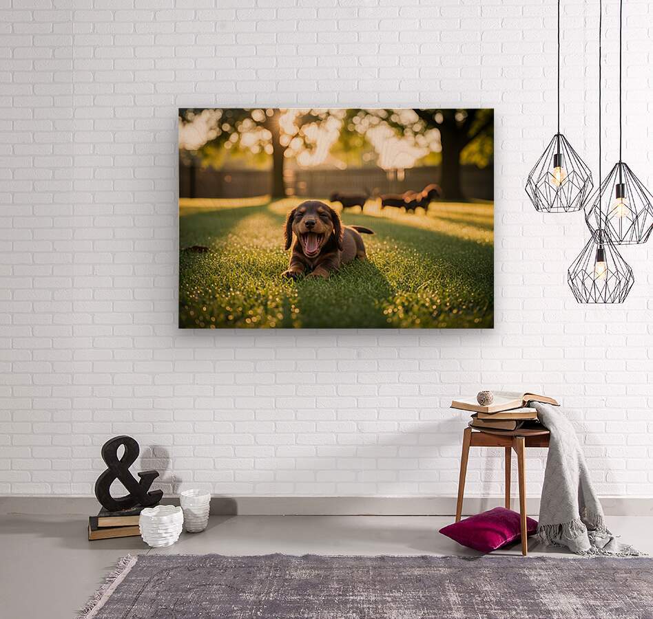 ABOUT THIS ARTWORK: BROWN DACHSHUND PUPPY WAKING UP IN SUNNY GARDEN