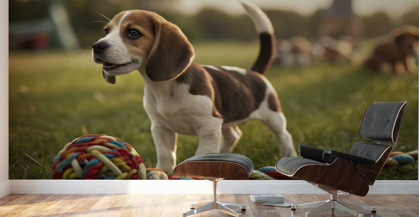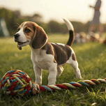 A cute brown and white beagle puppy with distinctive floppy ears stands eagerly beside a bright multicolored rope toy on green grass. The puppy's tail is wagging with excitement as other puppy siblings can be seen blurred in the background, creating a playful outdoor scene. Digital Artwork.