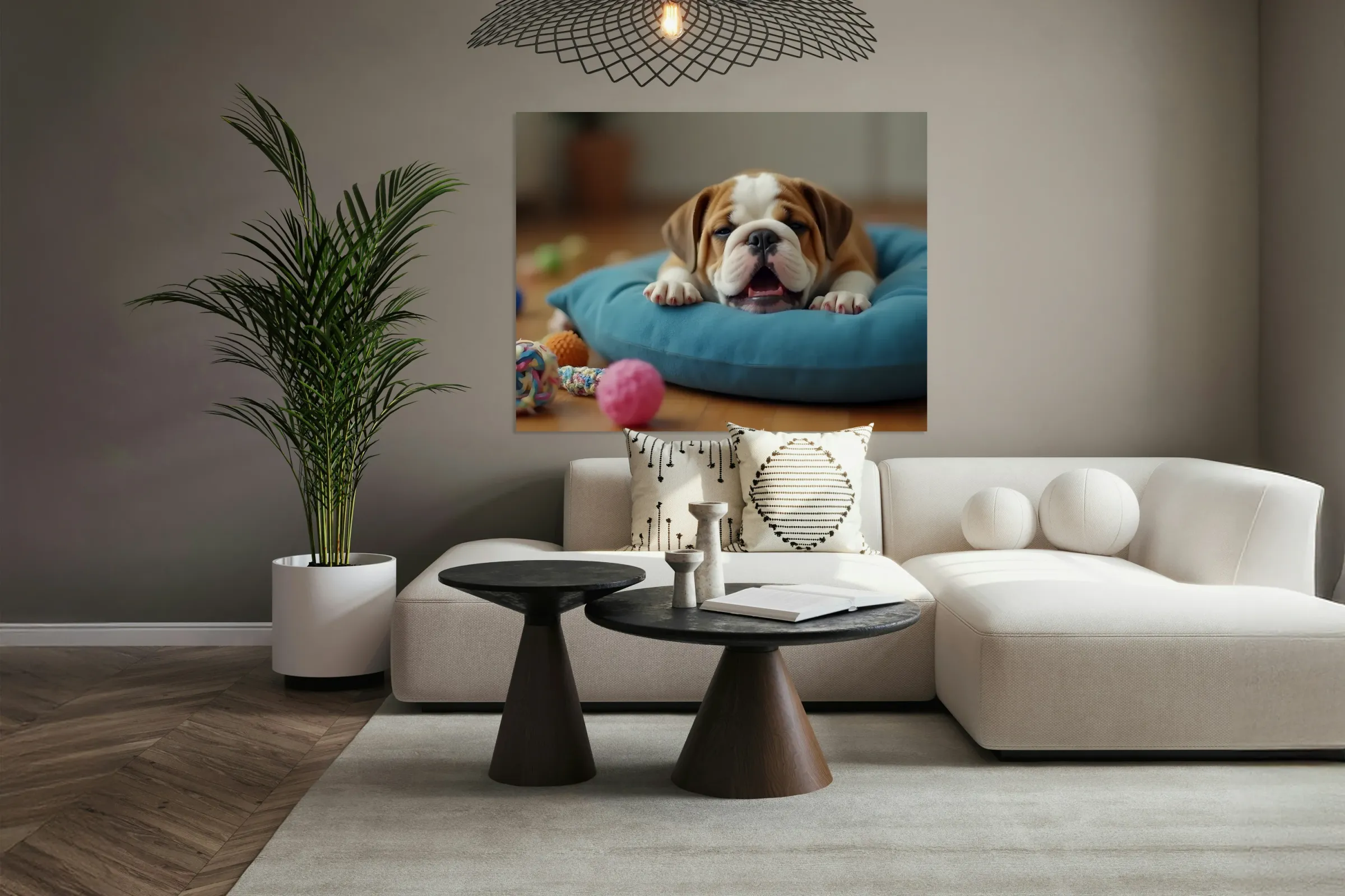 Sleepy Bulldog Puppy Yawns On Blue Cushion Picture Frame Printing