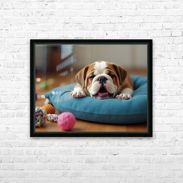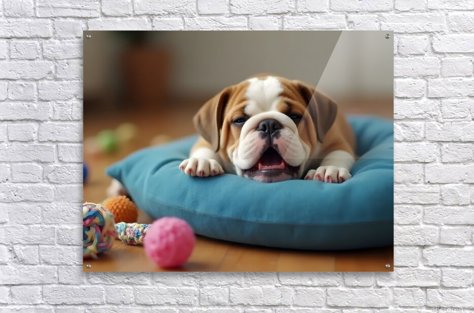 Get this artwork "Sleepy Bulldog Puppy Yawns On Blue Cushion" in a framed print.