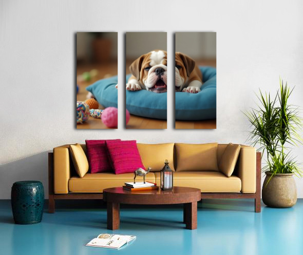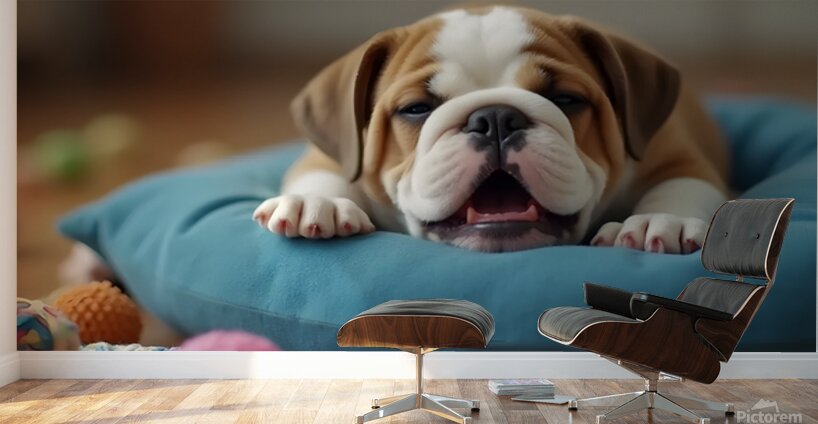 A tired brown and white bulldog puppy rests on a blue cushion, yawning with droopy eyes. Colorful toys are scattered around the wooden floor nearby. Digital Artwork.