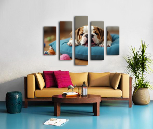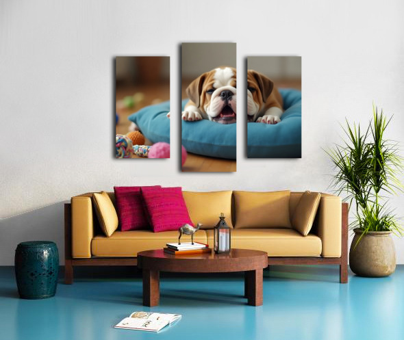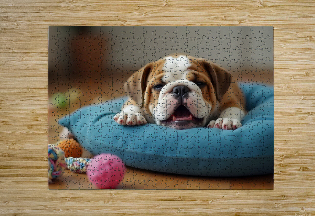 Sleepy Bulldog Puppy Yawns On Blue Cushion Puppy Prints Puzzle printing