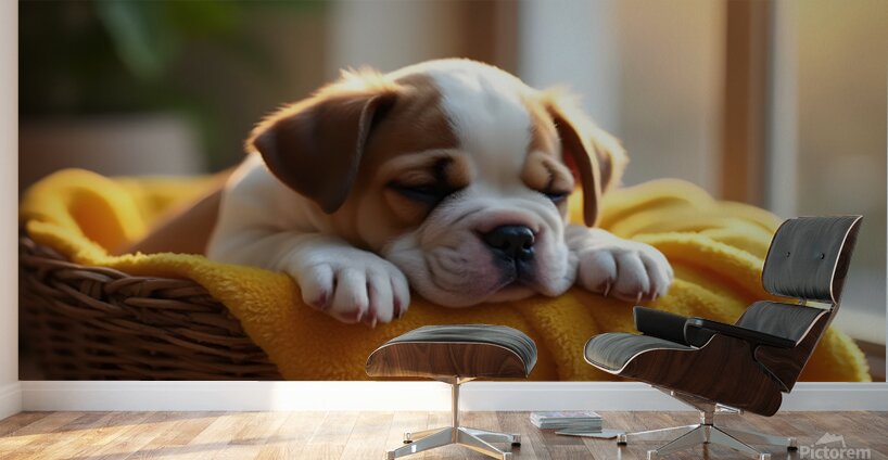 A brown and white bulldog puppy sleeps peacefully curled up in a wicker basket with a yellow blanket. Warm sunlight streams through a nearby window. D...[+]