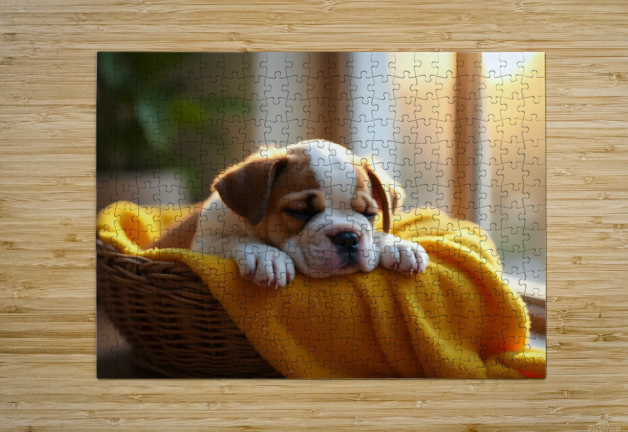 Bulldog Puppy Sleeps Peacefully In Wicker Basket Puppy Prints Puzzle printing