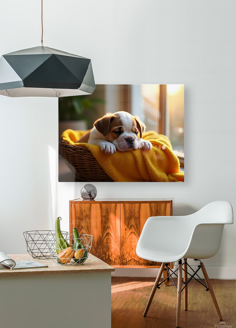A brown and white bulldog puppy sleeps peacefully curled up in a wicker basket with a yellow blanket. Warm sunlight streams through a nearby window. Digital Artwork.