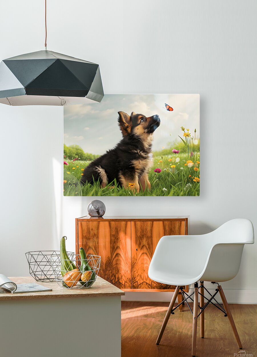 ABOUT THIS ARTWORK: GERMAN SHEPHERD PUPPY DISCOVERS BUTTERFLY IN MEADOW