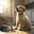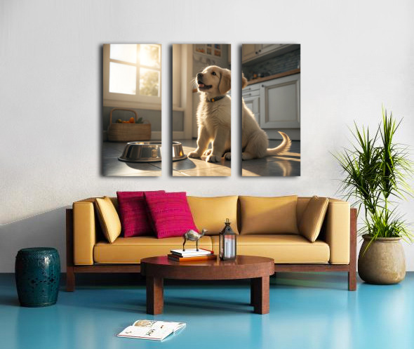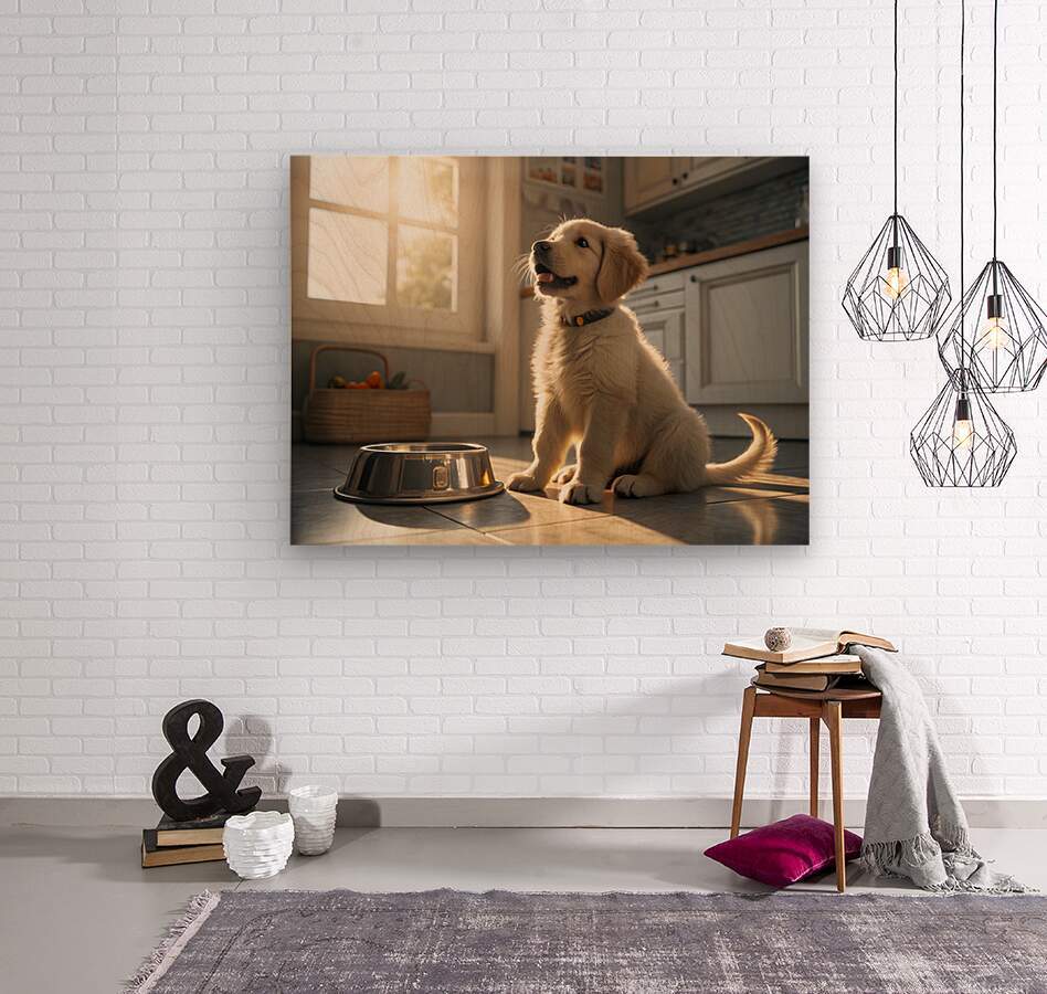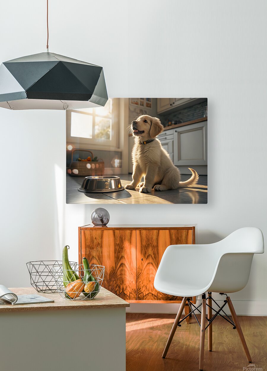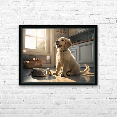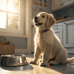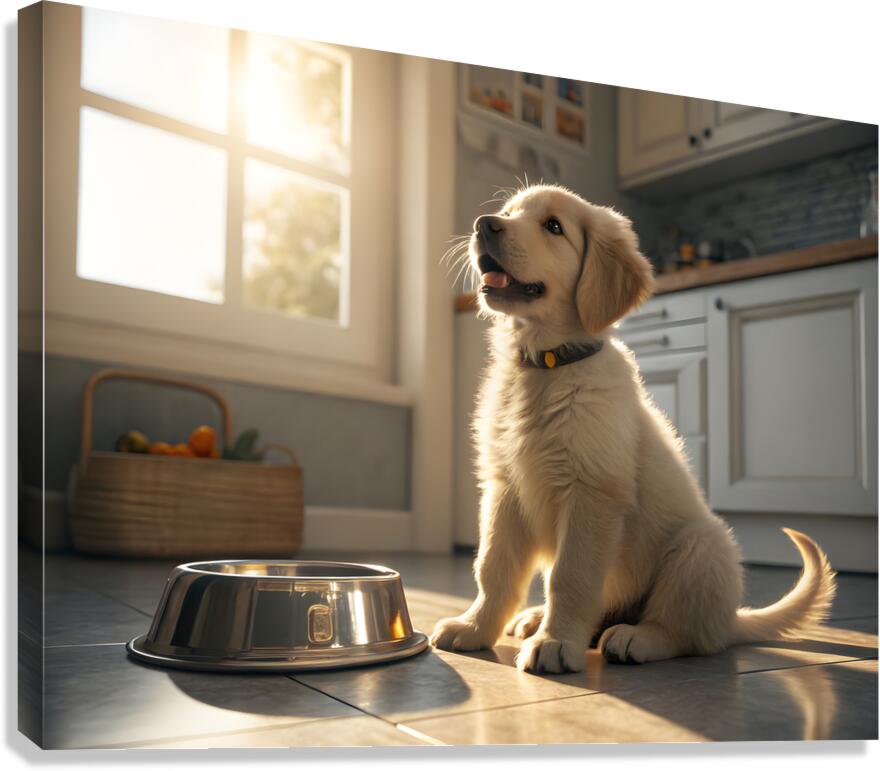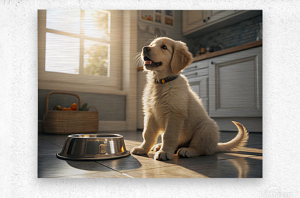A young golden retriever puppy sits beside an empty silver food bowl on a clean kitchen floor. The puppy's fluffy golden coat gleams in the morning light as it stares hopefully at the empty bowl with bright, expectant eyes. Digital Artwork.
