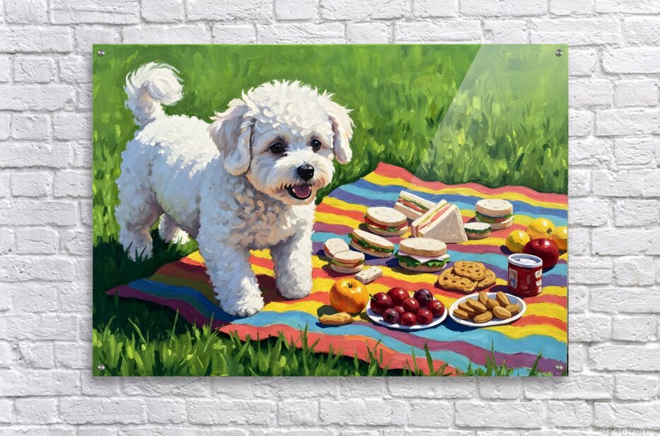 A small white fluffy Bichon Frise puppy with curly fur walks toward a red and white checkered picnic blanket laid out on bright green grass with an assortment of delicious foods displayed on ceramic plates. Digital Artwork.