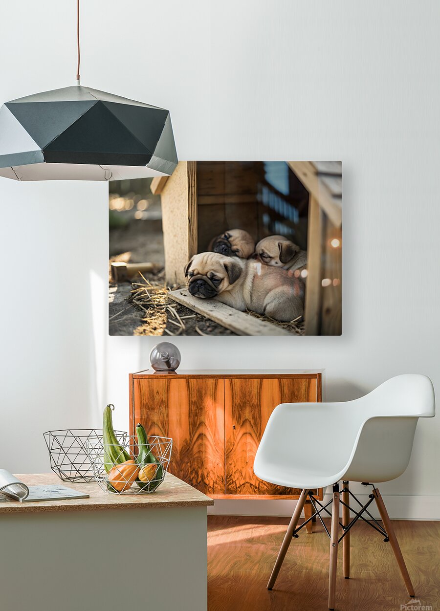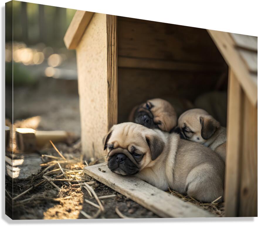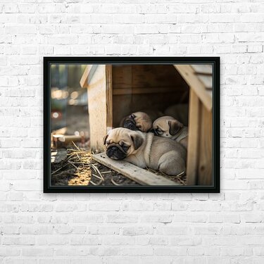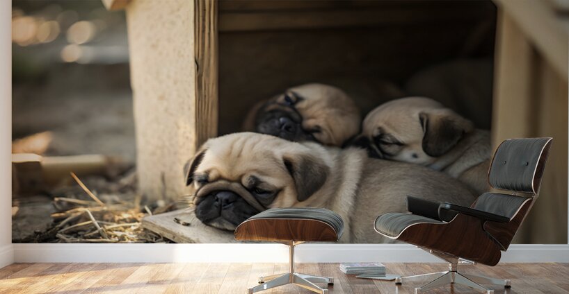 The content fawn pug puppy rests peacefully among other sleeping puppies in the wooden doghouse. All the puppies are curled up together in a cozy pile with soft light creating a warm sleepy atmosphere. Digital Artwork.