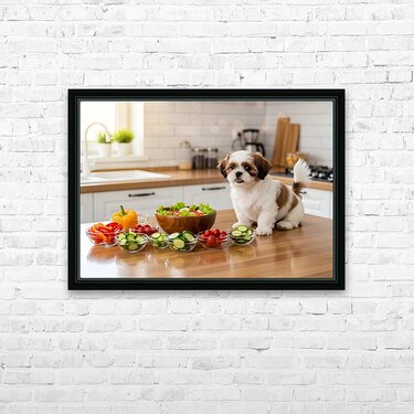 A joyful white and brown Shih Tzu puppy wags its tail in the now-tidy kitchen. Fresh ingredients are neatly arranged alongside a simple colorful veget...[+]