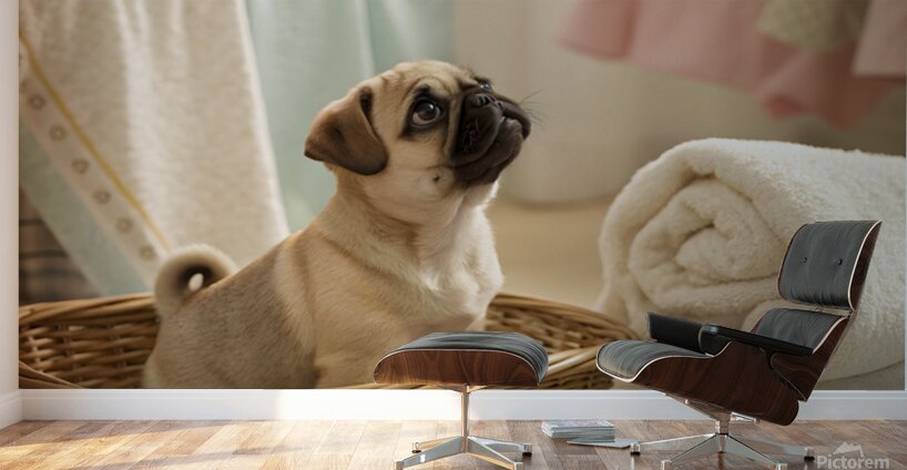 A tiny fawn pug puppy with characteristic wrinkled features sits in a wicker laundry basket filled with soft white and pastel towels gazing upward with curious dark eyes and an innocent expression. Digital Artwork.
