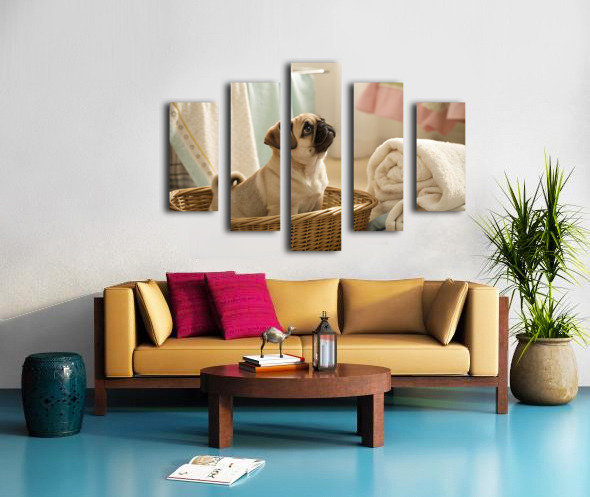Pug Puppy Discovers Cozy Laundry Basket Canvas print