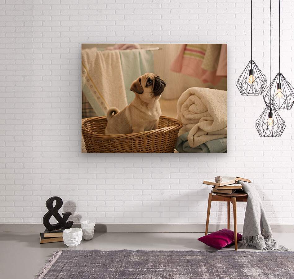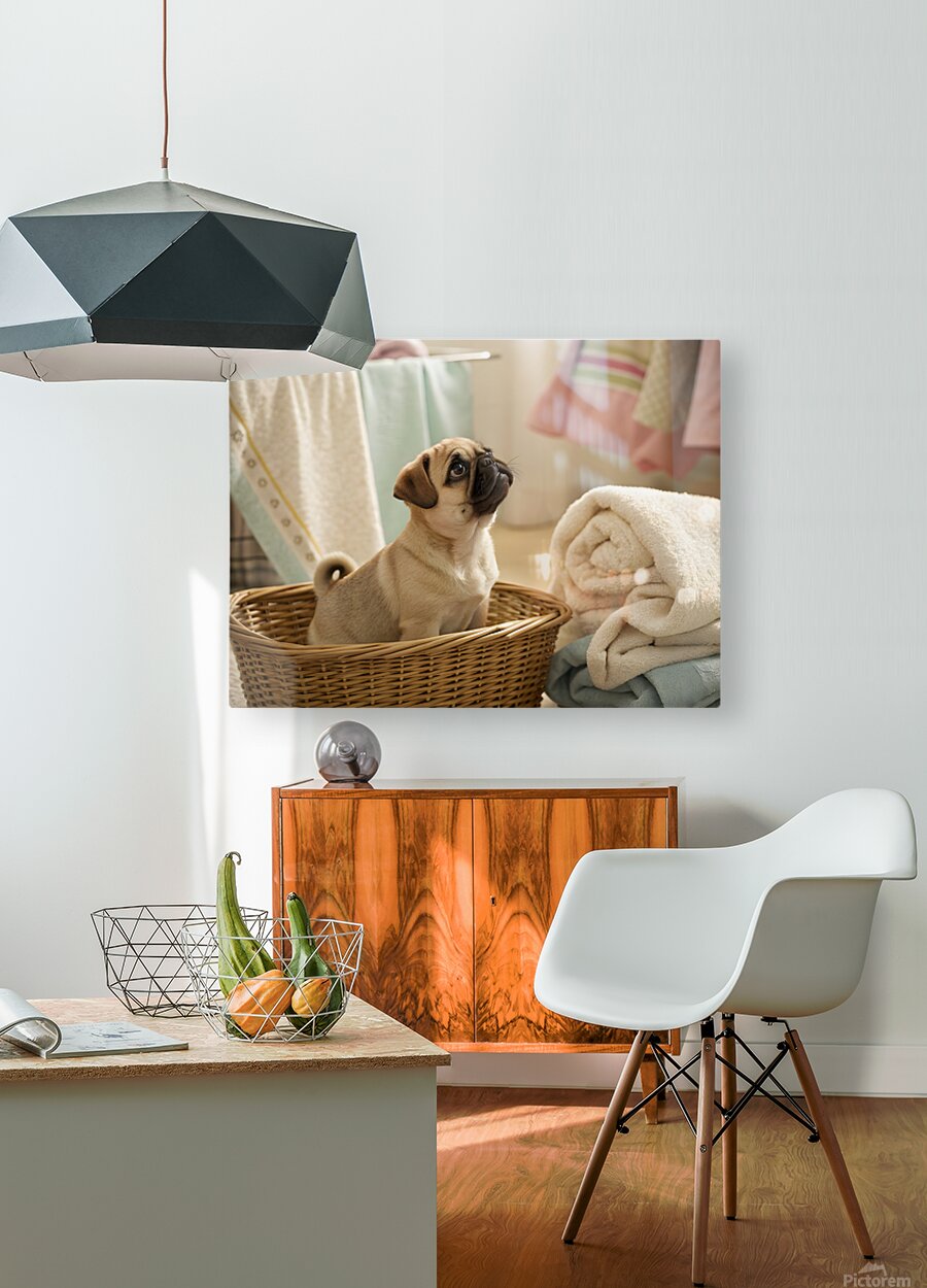 ABOUT THIS ARTWORK: PUG PUPPY DISCOVERS COZY LAUNDRY BASKET