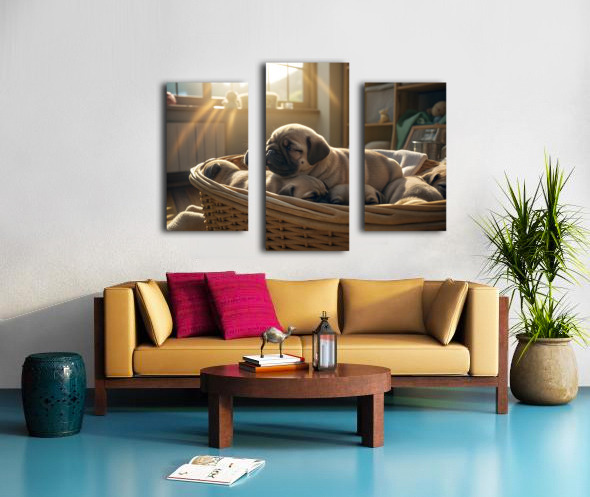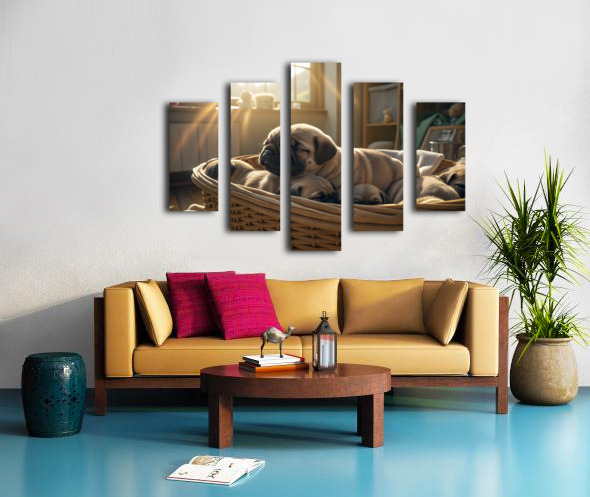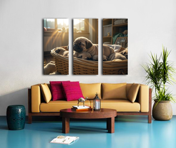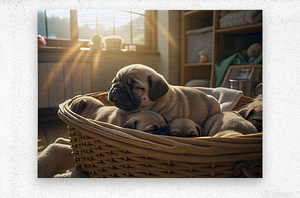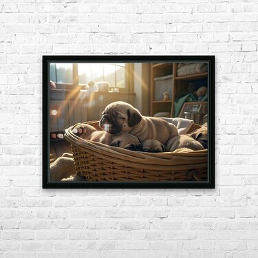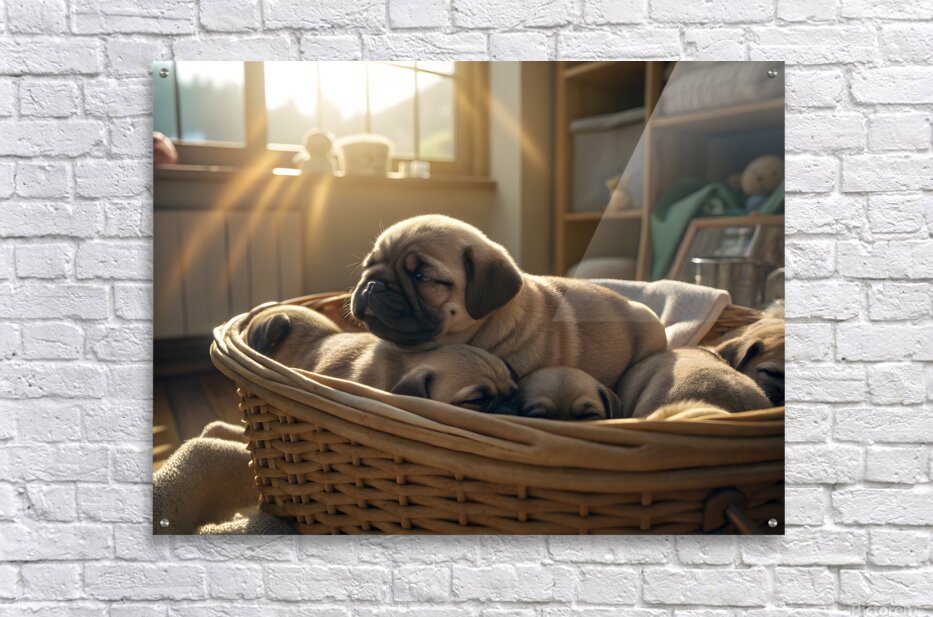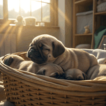 A peaceful fawn pug puppy sleeps soundly in the middle of a puppy pile within a wicker laundry basket bathed in gentle sunlight streaming through a window creating a warm and serene atmosphere. Digital Artwork.