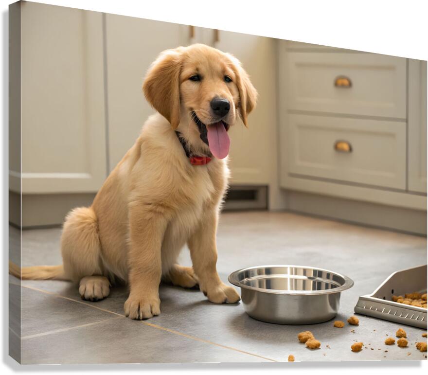 The golden retriever puppy sits contentedly beside the empty silver bowl with a few kibble crumbs scattered around. Its pink tongue peeks out slightly and its amber eyes look sleepy and satisfied after the delicious meal. Digital Artwork.