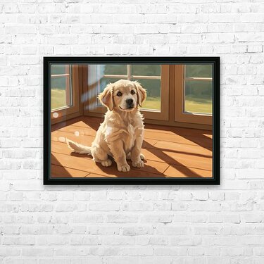 An adorable golden retriever puppy with fluffy cream fur sits upright on wooden flooring. The young pup appears energetic and alert with bright eyes perked ears and a slightly wagging tail. Warm sunlight creates a cozy atmosphere around the attentive puppy. Digital Artwork.