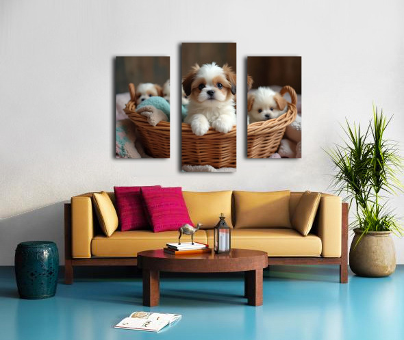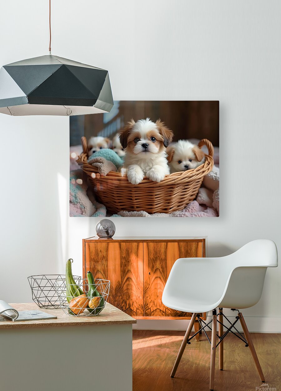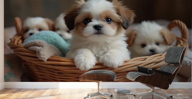A adorable white and tan Shih Tzu puppy sits upright in a wicker laundry basket surrounded by soft colorful fabrics. The puppys fluffy coat and bright eyes show curiosity as other puppies sleep peacefully around them in the cozy space. Digital Artwork.