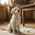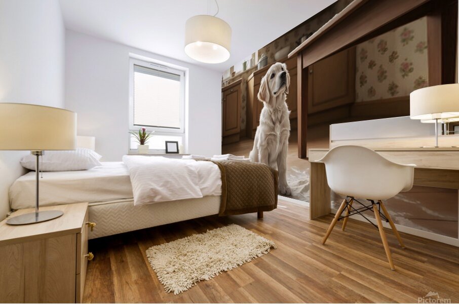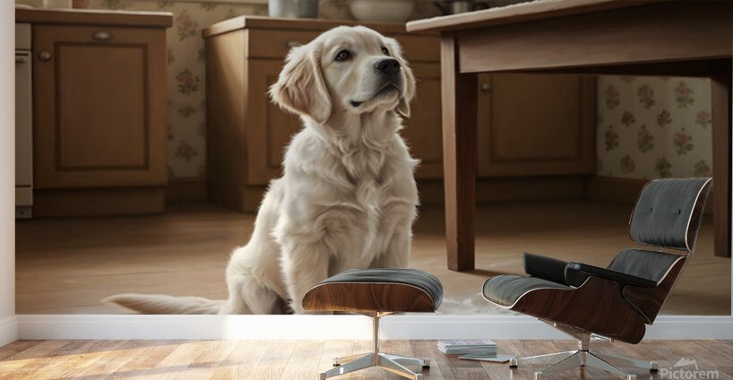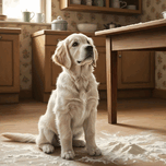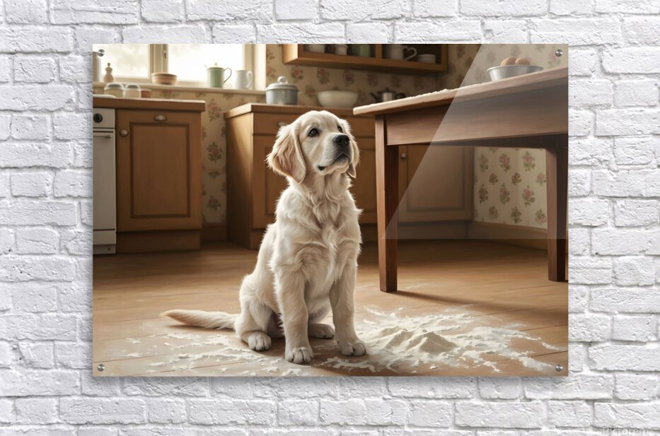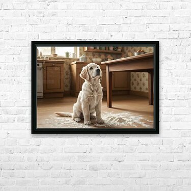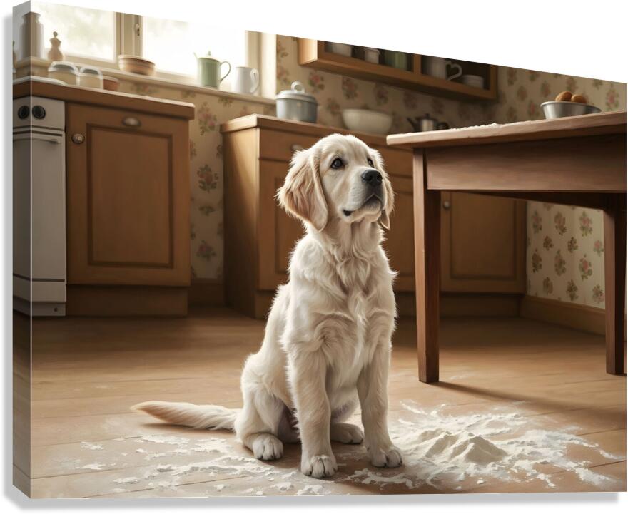A golden retriever puppy with cream fur sits calmly in the kitchen still lightly covered with flour dust. The puppy looks up with bright hopeful eyes and wagging tail flour particles settled around on the floor. Digital Artwork.