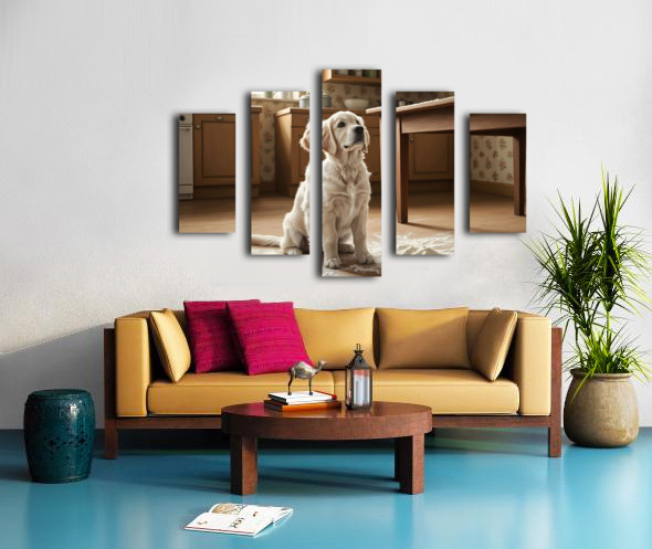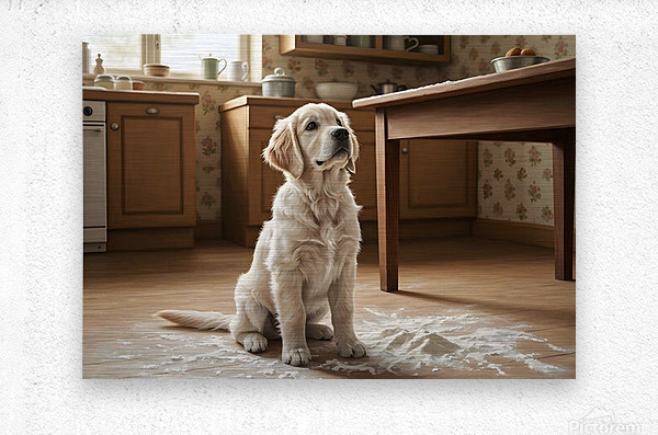 A golden retriever puppy with cream fur sits calmly in the kitchen still lightly covered with flour dust. The puppy looks up with bright hopeful eyes and wagging tail flour particles settled around on the floor. Digital Artwork.