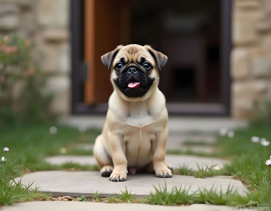 A happy tan and black pug puppy with a wrinkled face sits proudly on a stone patio. The small dogs tongue is slightly visible and it looks content surrounded by green grass and colorful flowers. Digital Artwork.