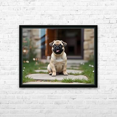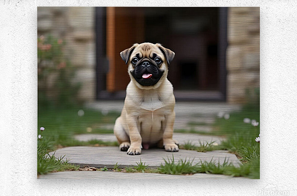 Tan and black Pug puppy with a wrinkled face sits proudly on a stone patio Picture Frame Printing