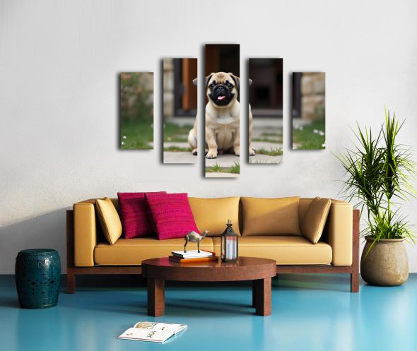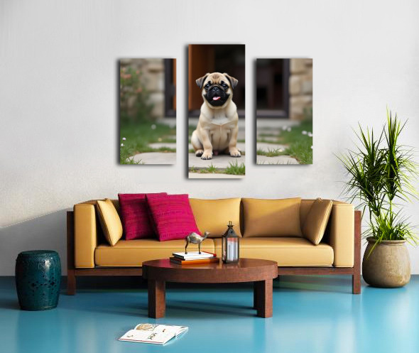 Tan and black Pug puppy with a wrinkled face sits proudly on a stone patio Canvas print