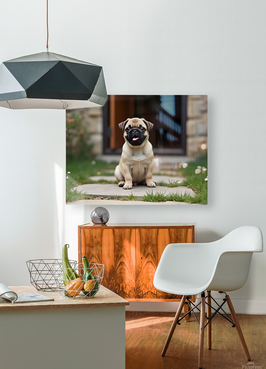 ABOUT THIS ARTWORK: TAN AND BLACK PUG PUPPY WITH A WRINKLED FACE SITS PROUDLY ON A STONE PATIO