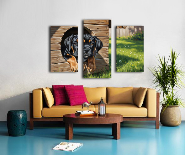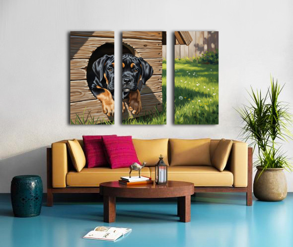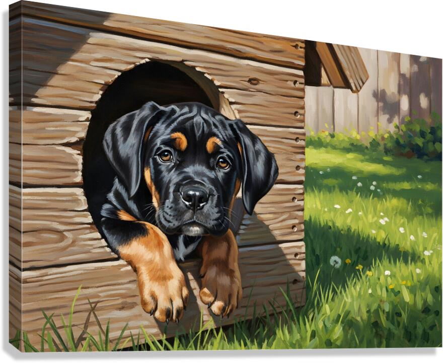 Curious Cane Corso Puppy Peeks From Doghouse Canvas print