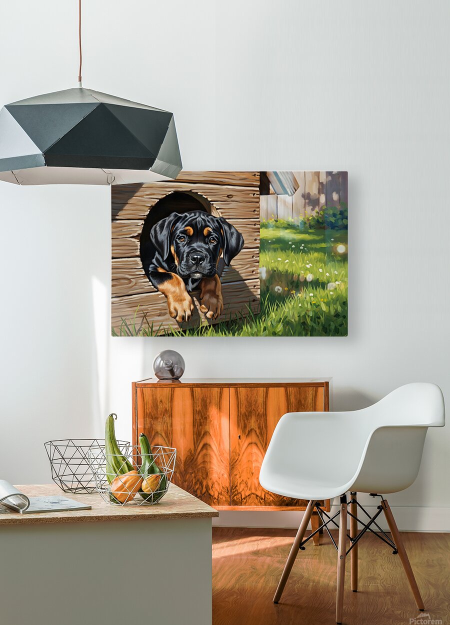 Get this artwork "Curious Cane Corso Puppy Peeks From Doghouse" in a framed print.