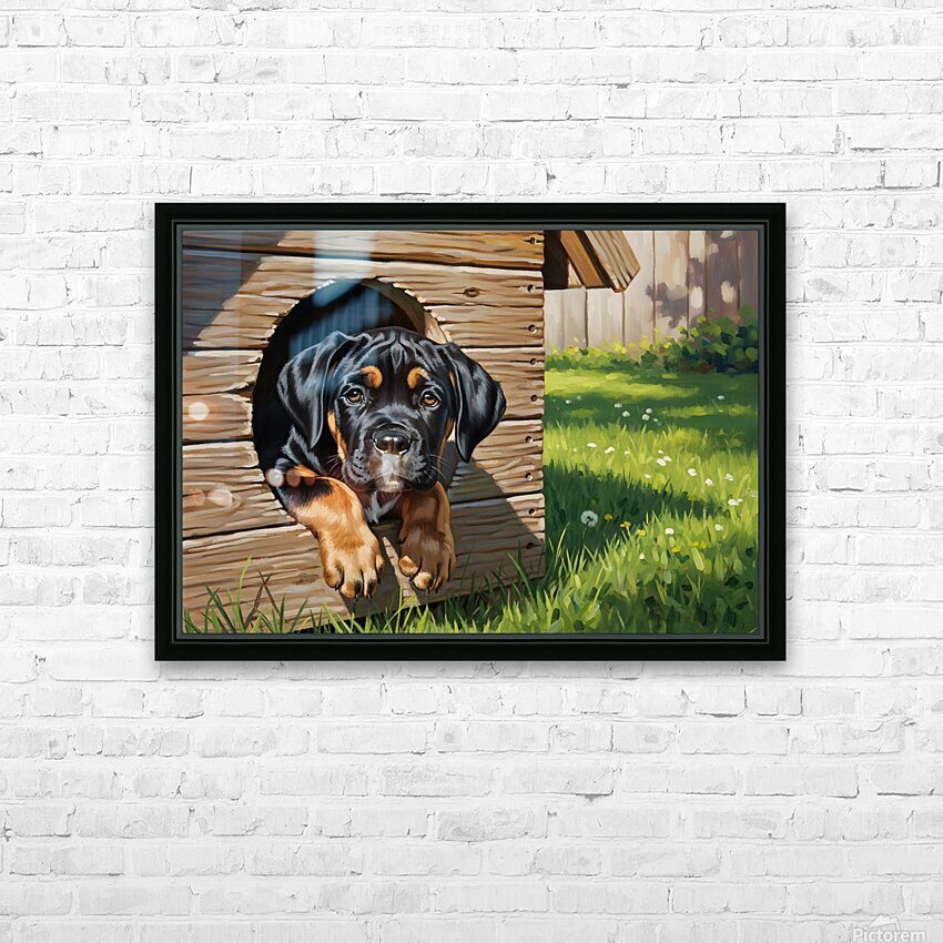 Curious Cane Corso Puppy Peeks From Doghouse Frame print