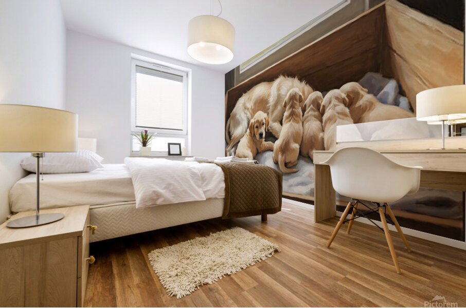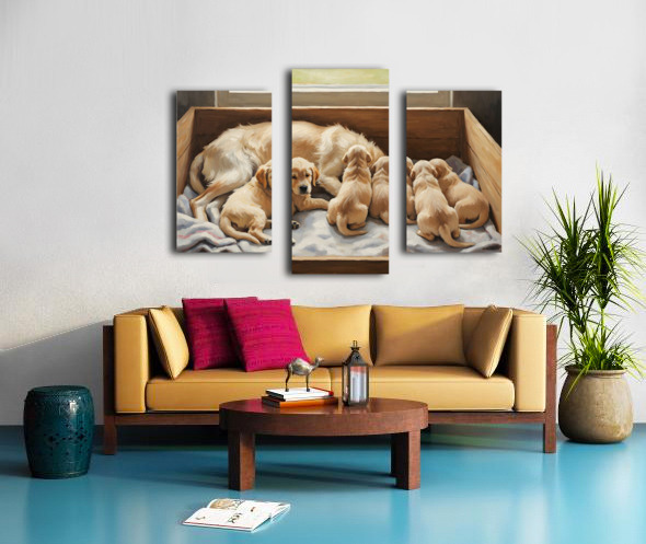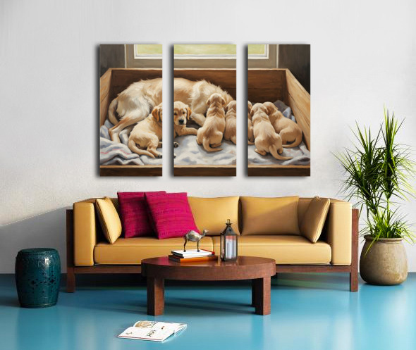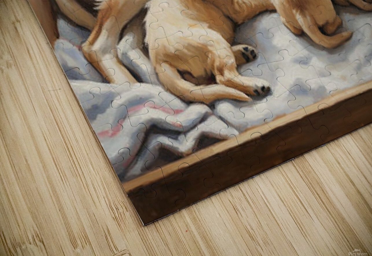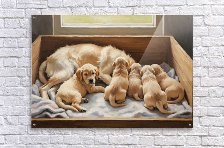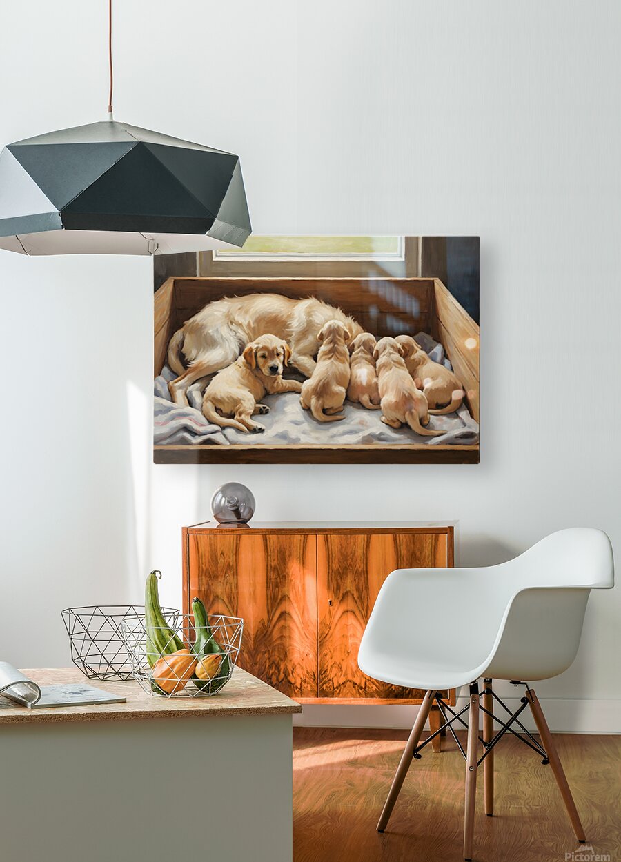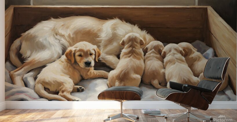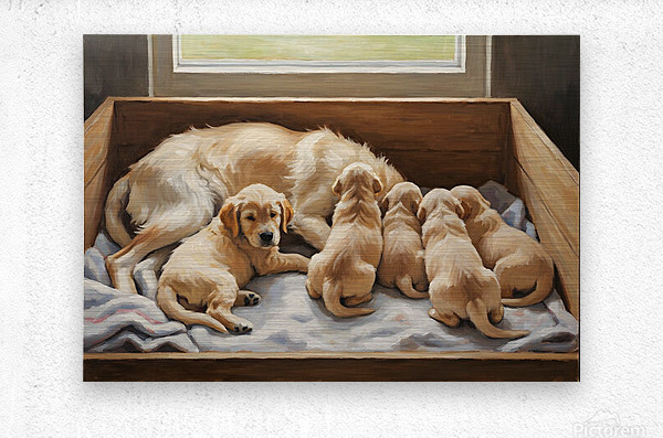 ABOUT THIS ARTWORK: GOLDEN RETRIEVER PUPPY FINDS COMFORT WITH MOTHER