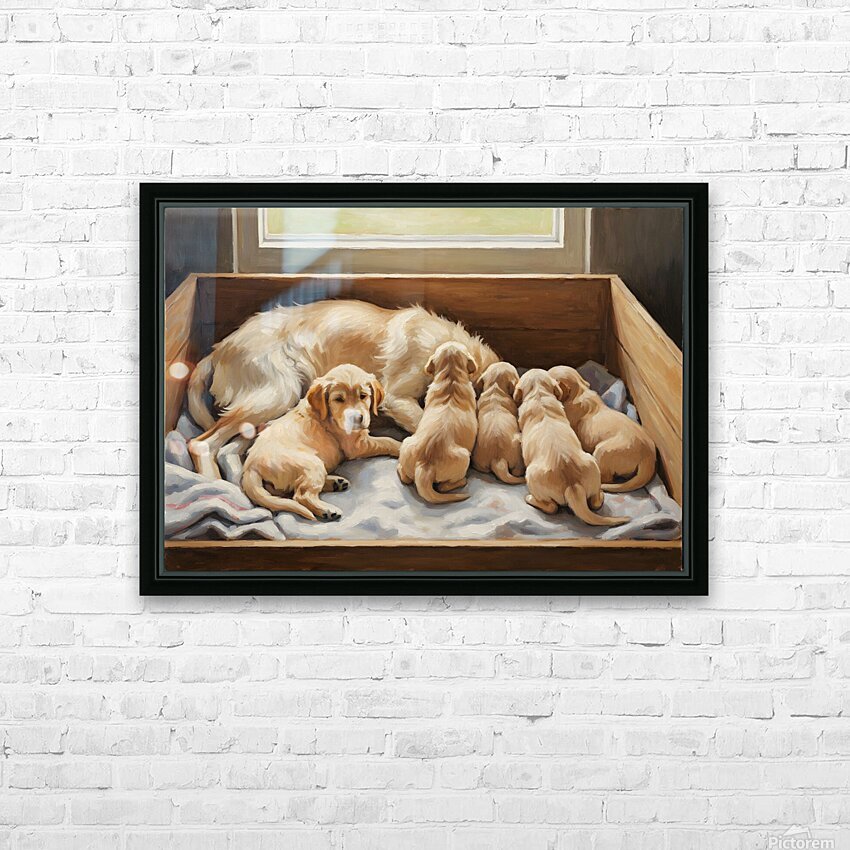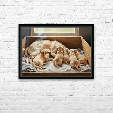 Get this artwork "Golden Retriever Puppy Finds Comfort With Mother" in a framed print.