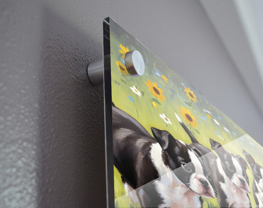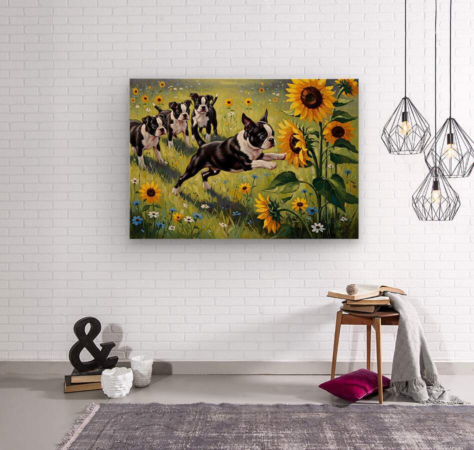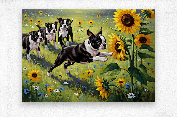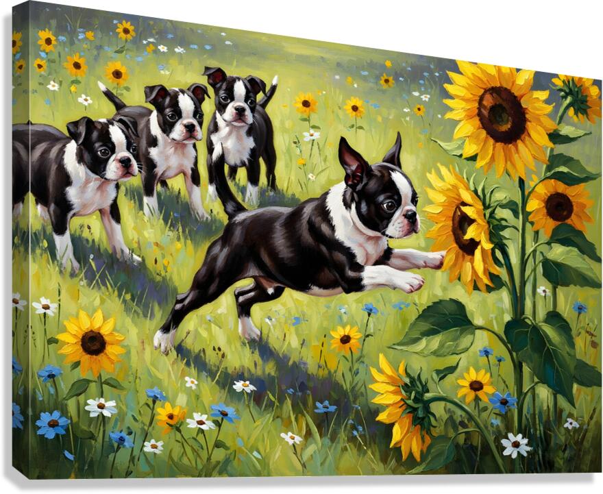 ABOUT THIS ARTWORK: BOSTON TERRIER PUPPY PLAYS NEAR BEAUTIFUL SUNFLOWER