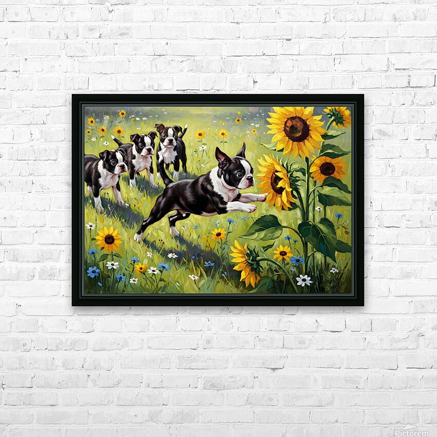 Get this artwork "Boston Terrier Puppy Plays Near Beautiful Sunflower" in a framed print.