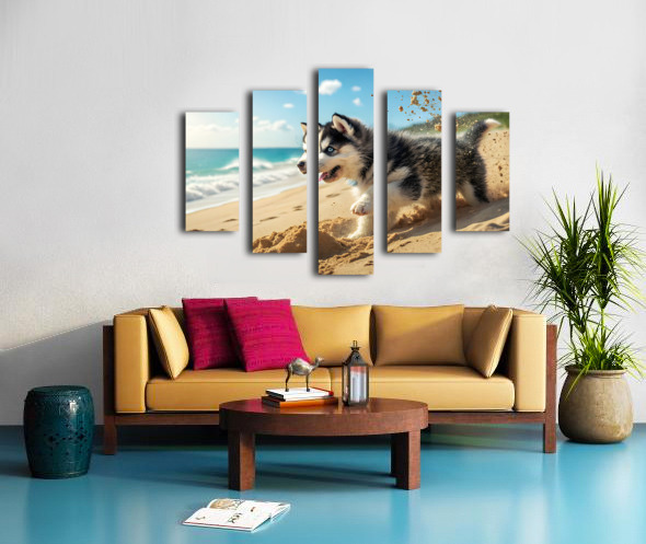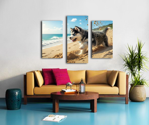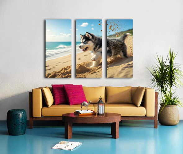 Siberian Husky Puppy Discovers Sandy Beach Fun Canvas print