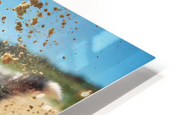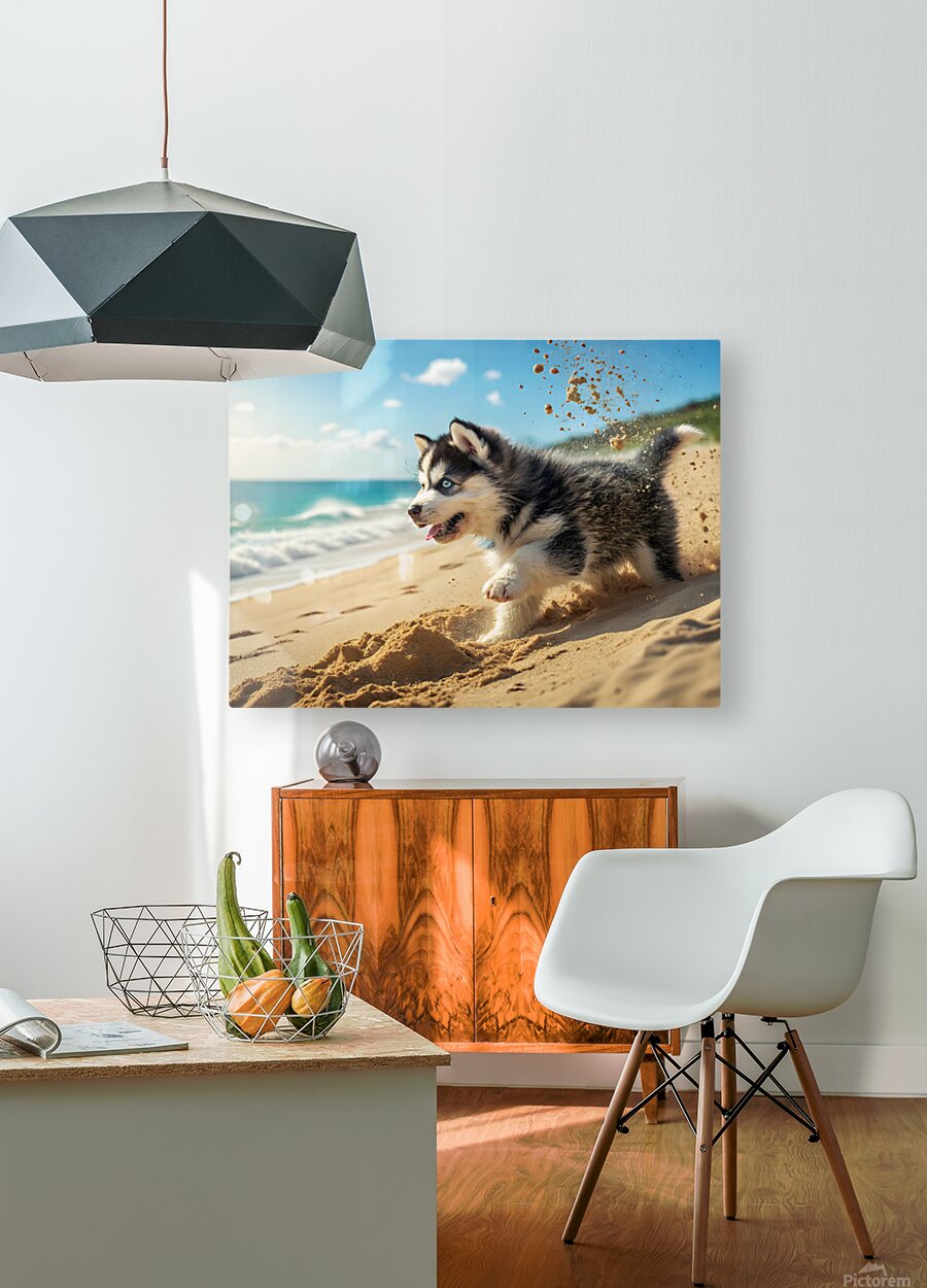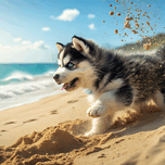 A young black and white Siberian Husky puppy with striking blue eyes begins digging excitedly in warm golden sand at a beach. The puppy's fluffy coat contrasts beautifully with the sand as tiny paws work energetically. Digital Artwork.